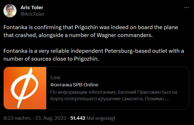 Ich habe jetzt schon einige Male von deutschen „Russland-Fans“ gelesen, dass das ein genialer Schachzug von Putin war, um Wagner ganz nah an die Grenze von Kiew zu bringen.