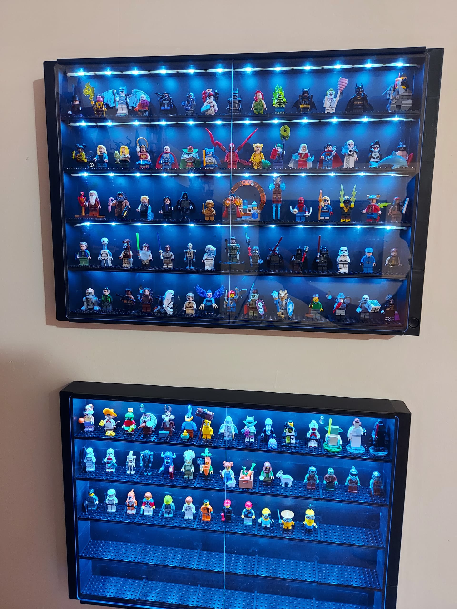 Einige besondere Minifiguren wohnen in beleuchteten Displays, die gibt’s für wenige Euros im Symthtoys und kommen gut an.