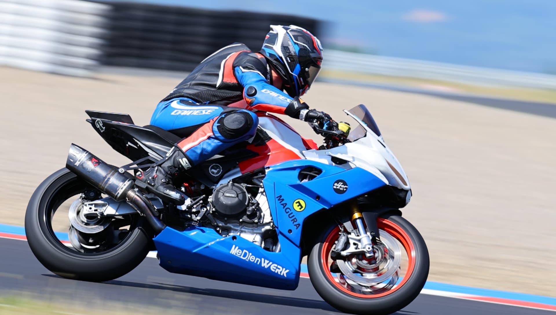 Dann ging ich auf Regenreifen raus. Das frisch aufgebaute Motorrad nach dem Crash in Schleiz hatte noch keine echte Probefahrt absolviert. Zu meiner Schande muss ich gestehen, dass mir eines nicht aufgefallen war. Das Federbein war extrem weich. Das bemerkte auch mein aufmerksamer Mechaniker Lorenz und wies mich darauf hin, bevor ich rausging. Nach wenigen Metern auf der Strecke war klar, dass da was nicht passte. Ich fuhr nur auf der Feder. Gleichzeitig wollte ich das Motorrad aber zumindest einmal heiß fahren und schauen, ob sonst alles funktioniert. Nach fünf Runden ging es wieder rein und die Diagnose war klar: Das Federbein muss vermutlich beim Sturz den Gasdruck verloren haben, da war nix zu machen.