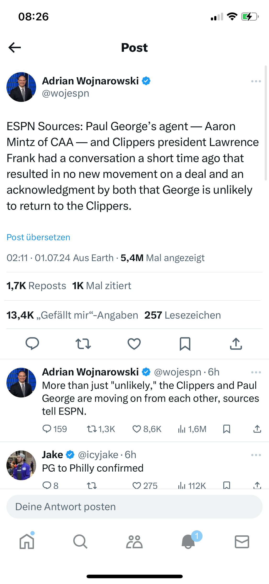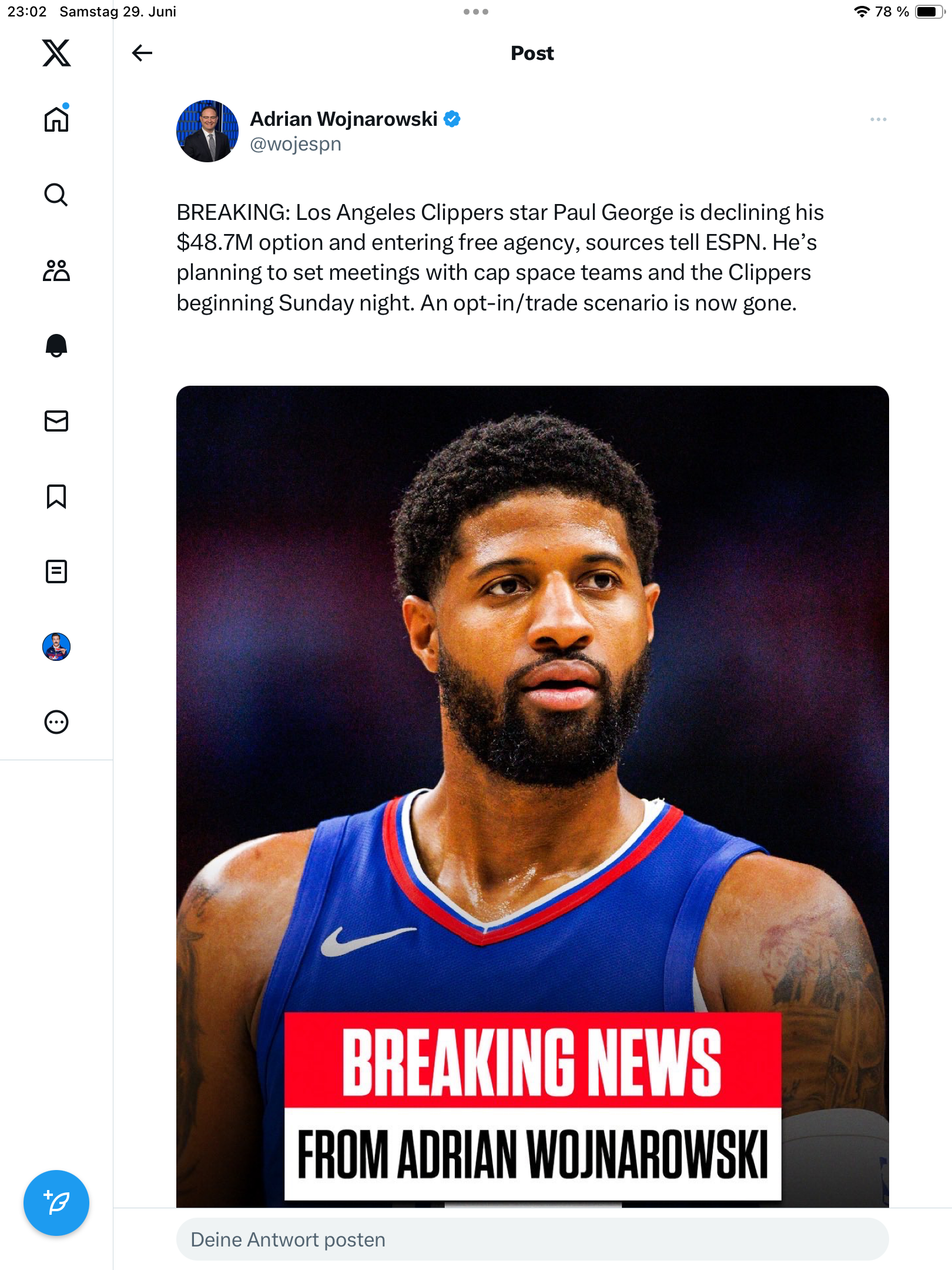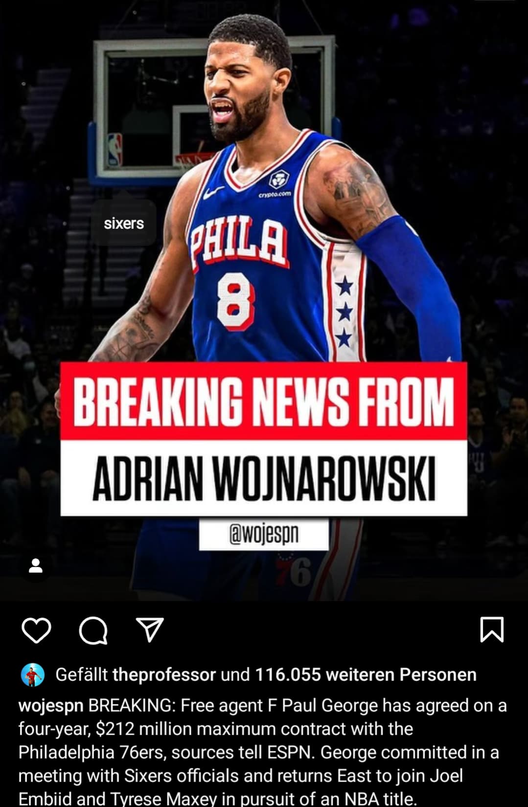 Hoppla. Wenn George wirklich gehen sollte, sehe ich auch Kawhi und vor allem Harden sehr schnell einen Trade fordern.