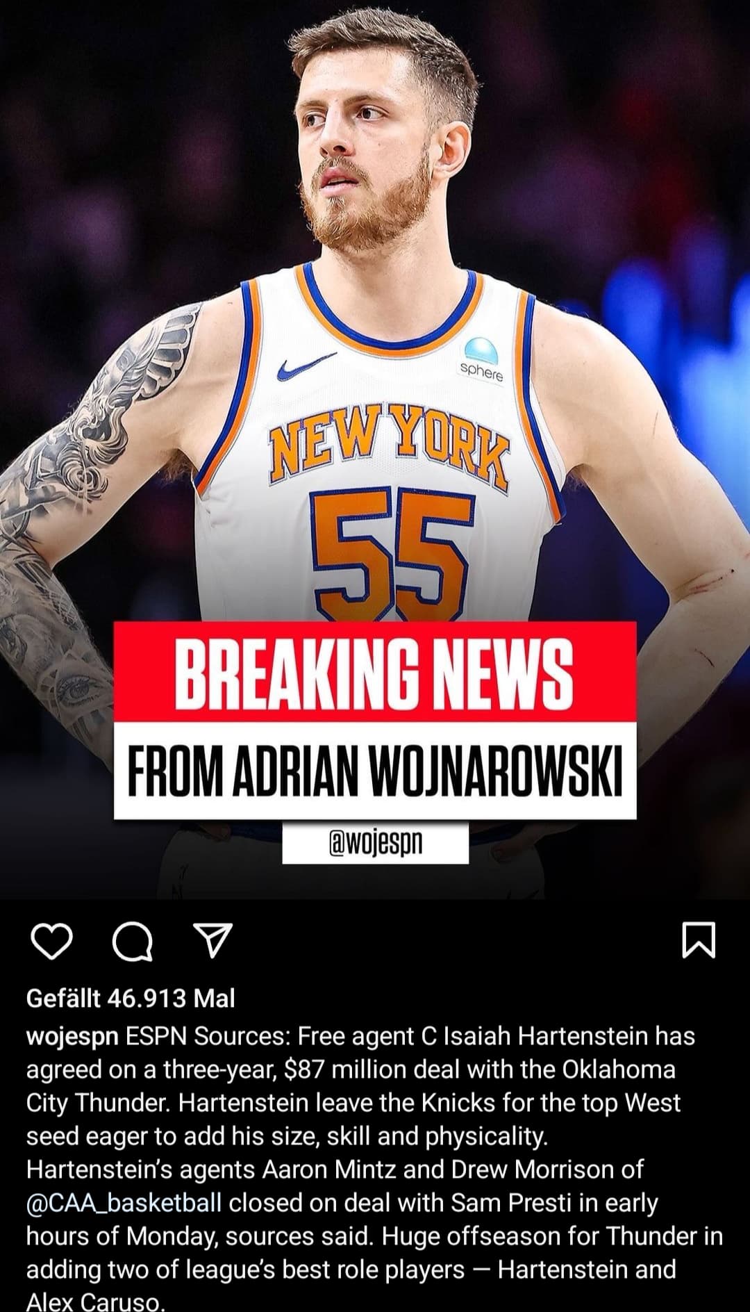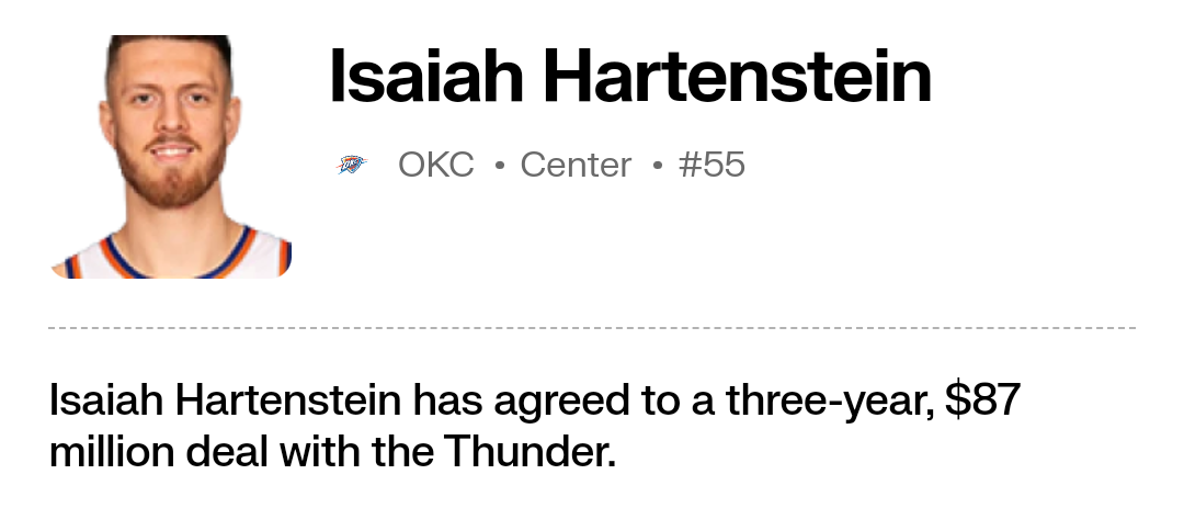 Freut mich total für Hartenstein. Den Vertrag hat er sich wirklich hart erarbeitet. Und in OKC als physischer Backup für Holmgren ein super Fit. ![]()