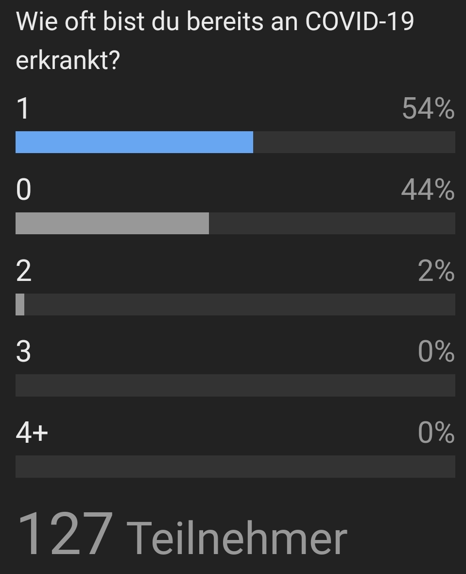1 Tag nachdem ich hier diese blöde Umfrage gemacht habe auf „0“ hat es mich erwischt…4 Tage richtig richtig schlimm. Geschmack und Geruch komplett weg…das linke Ohr ist taub (so wie als wenn du tauchen warst und Wasser im Ohr hast). Heute geht es erstmals einigermaßen.
