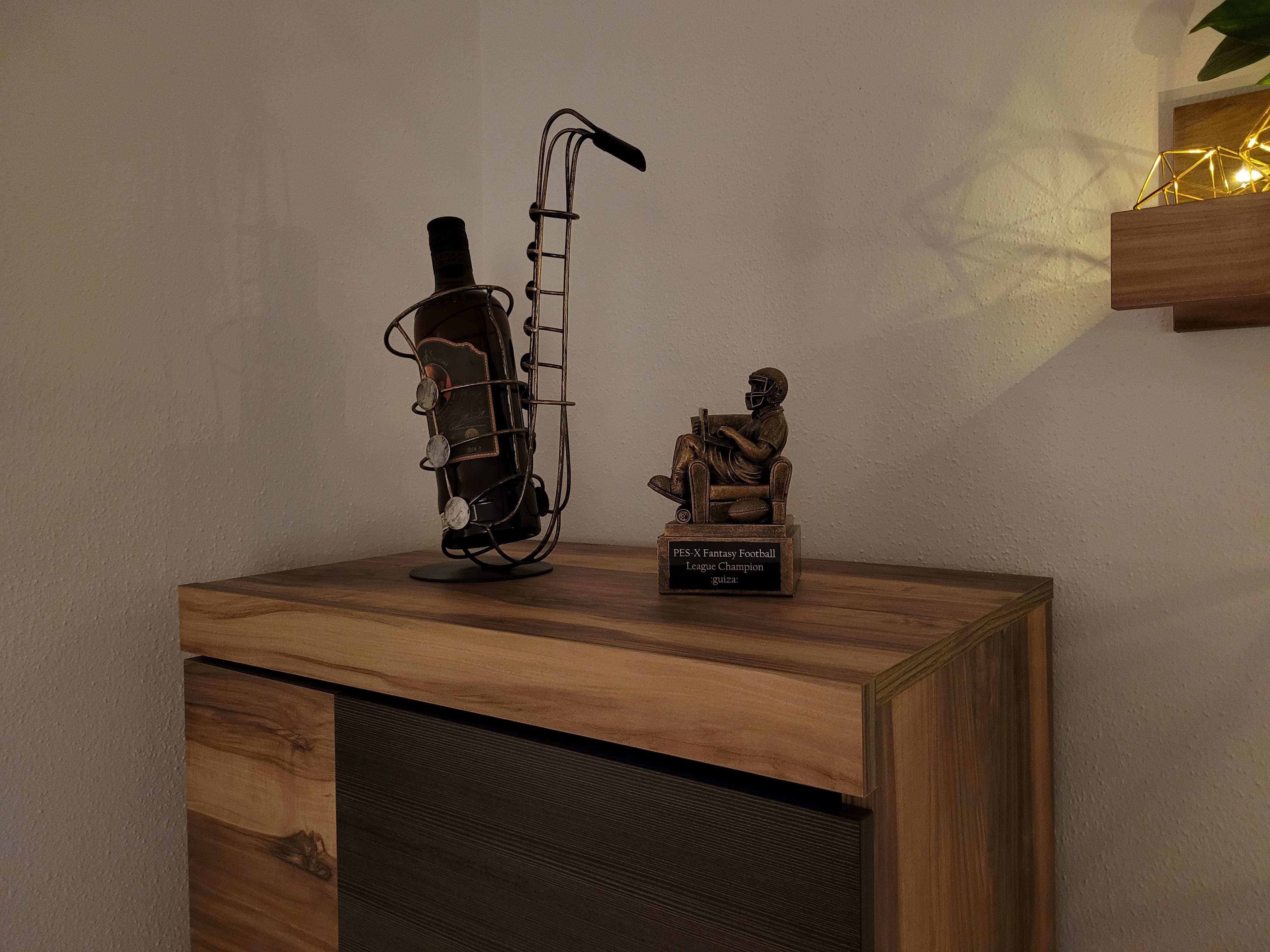 Bei mir hat Justin II die Saison hinweg selig über den Spieleschrank gewacht und durfte sonntags gemütlich aus dem Sessel heraus Redzone mitschauen. Er wollte noch nicht weiterziehen, ich habe ihm aber die Kunde überbracht, dass er es mindestens genauso gut haben wird im kommenden Jahr. Möge er ein schönes neues Zuhause finden. ![]()