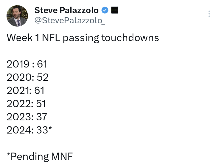 Irre wie wenig da passiert ist in Week 1. Und genau so hat es sich auch angefühlt. Gleichzeitig kann man nicht sagen dass das passiert weil das Laufspiel so viel besser ist. Die meisten RB avg. Zahlen sind richtig furchtbar.