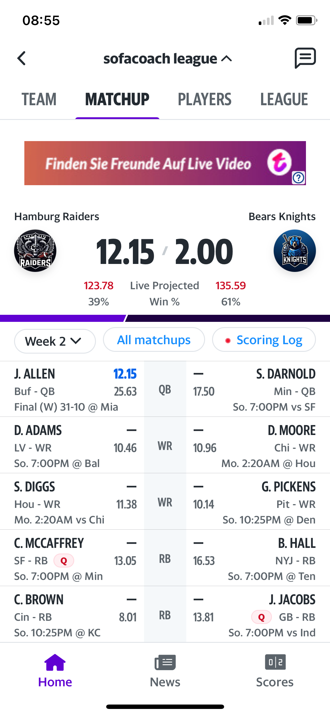 Ja. Was ein Glück, dass mein QB nur die Hälfte seiner projected Points gemacht hat, nachdem er im ersten Spiel noch vier TDs hatte. ![]()