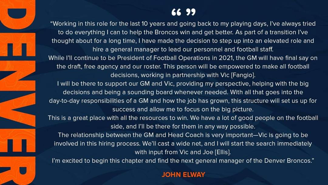 Elway zieht sich als GM zurück und wird President of Football bei den Broncos. Es kommt ein neuer GM. Bin gespannt wer und wie der in Sachen QB Situation denkt.