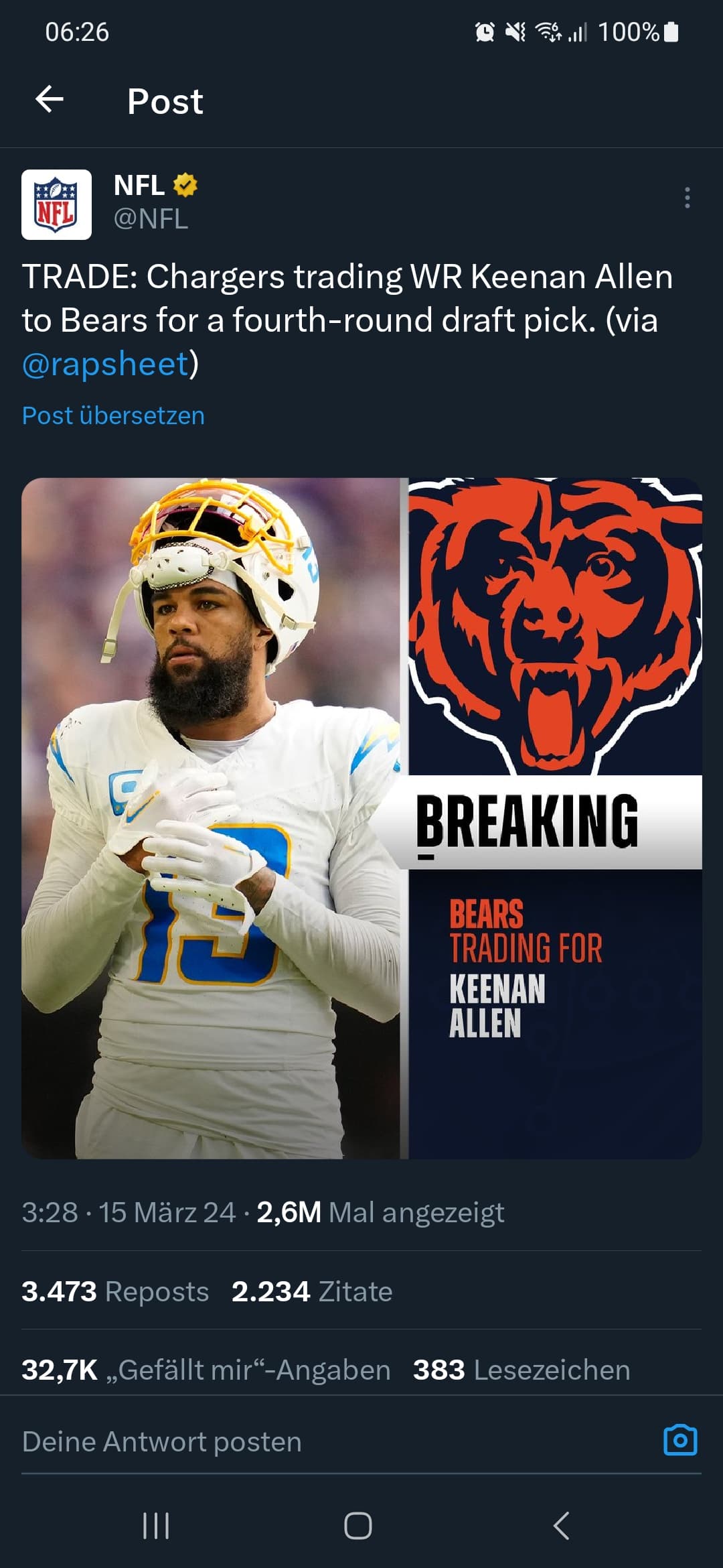 Ebenso verwundert bin ich darüber dass die Chargers die Legende Keenan Allen traden. Das WR Corps sieht jetzt nicht so geil aus bei den Chargers. Da muss eigentlich noch ein FA WR und einer aus Runde 1 oder 2 im Draft her. Tyler Boyd + Malik Nabers wäre schon etwas schönes für die Chargers. Andererseits ist da jetzt Harbaugh das heißt die werden im Draft Corum holen dazu noch O-Liner und einen FB und ab durch die Mitte.