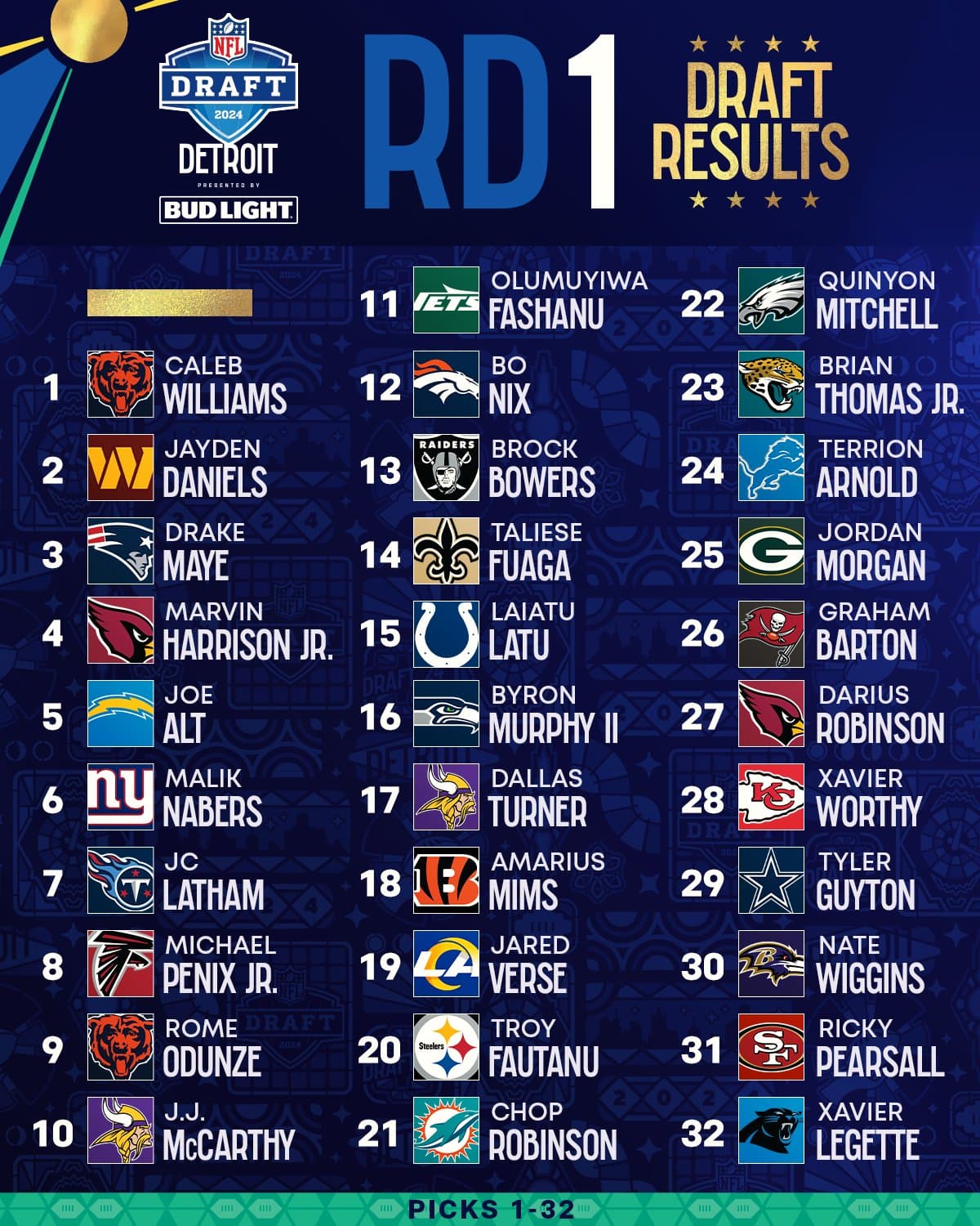 Na bis auf den Penix Schocker war das doch eine recht erwartbare erste Runde (Broncos eigentlich laut Konsens auch zu früh dran bei Nix, aber die hatten einfach kein Kapital um den später zu holen und bei dem aktuellen QB Room…).