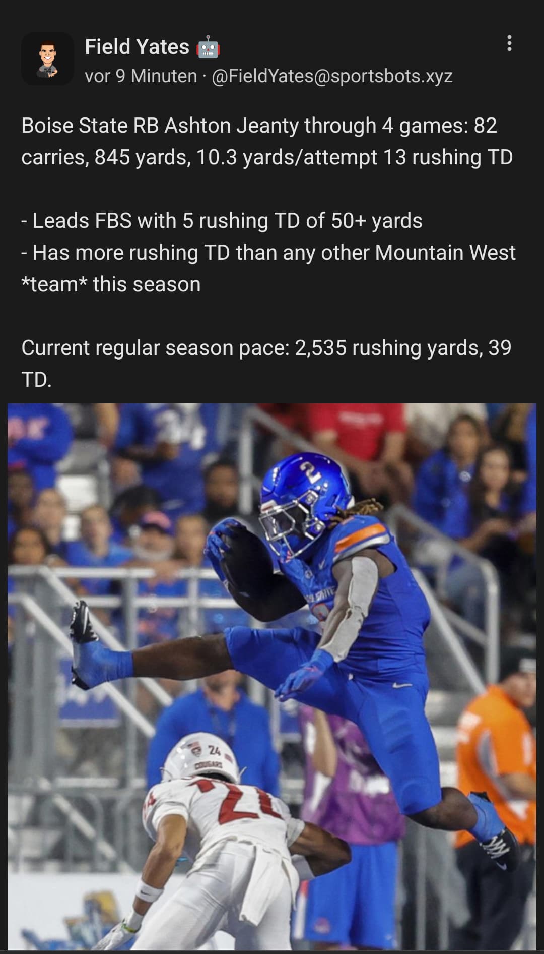 Mal sehen wie lange es hält, normalerweise hat er ja seine 2-3 off Spiele/Saison. Es scheint ihm aber gut zu tun, dass er den Ball nach seinem Gusto frei verteilen „darf“, ohne dass ihn sein WR1 schief anschaut oder sich nach dem Spiel über die Medien beschwert