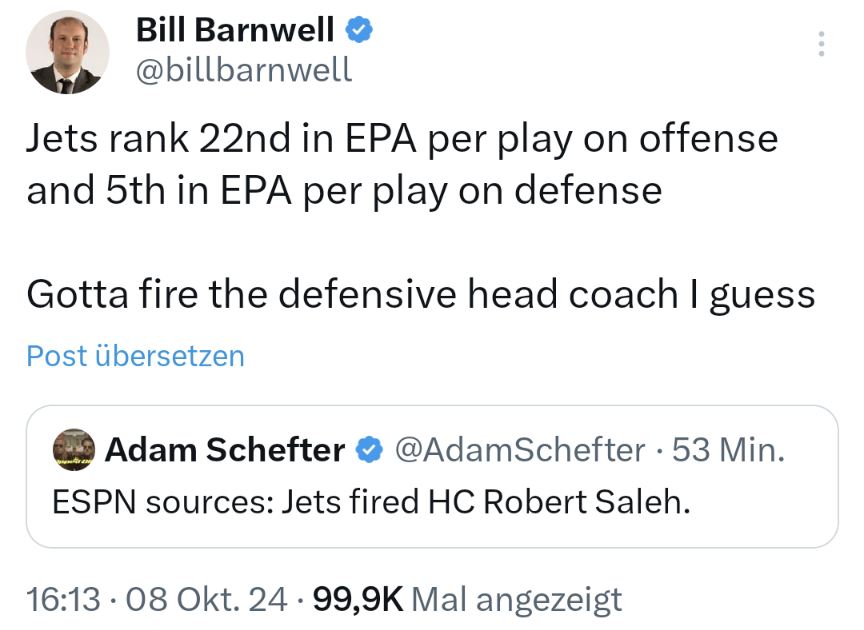 Saleh war ohnehin viel zu nett und zu gut für den Job in dem Haifisch Becken bei den Jets. Mal schauen was da jetzt passiert. Belichick? Oder der Interims HC holt ein paar W und bleibt mal bis Saisonende.