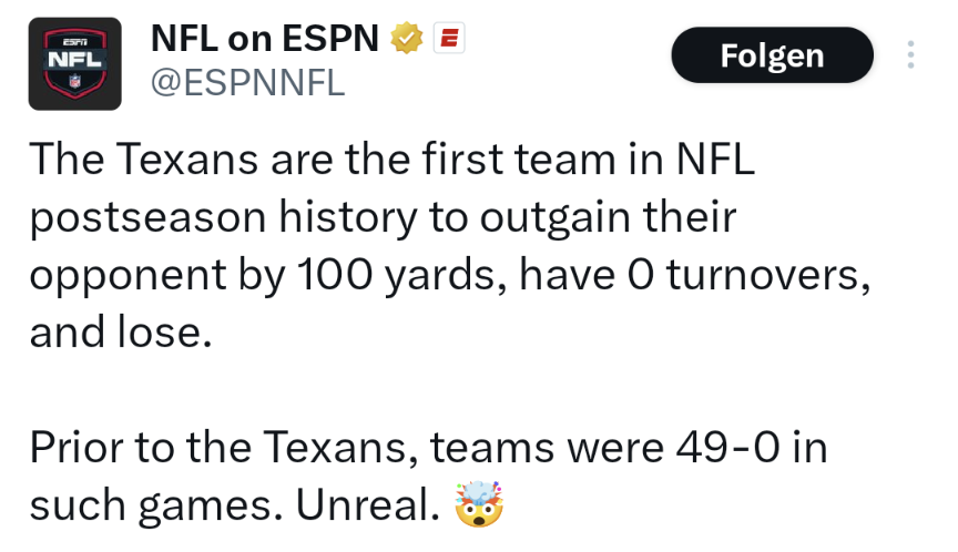 Mein Hot Take, das wahrscheinlich so schnell sauer wird, wie frische Milch in der Sonne: Ich glaub die Texans werden den Chiefs heute Abend einen ordentlichen Schocker verpassen. Will Anderson und Danielle Hunter sind kein gutes Matchup gegen eine Offensive Live mit Problemen auf Tackle. Was auch immer die Chiefs als „WR1“ aufbieten wollen, wird von Dereck Stingley neutralisiert. Das wird ein richtig hartes Stück Arbeit in der Offensive für die Chiefs und wenn die Texans wie in der Wild Card Runde den ein oder anderen Turnover produzieren können, kann das Spiel schnell kippen.