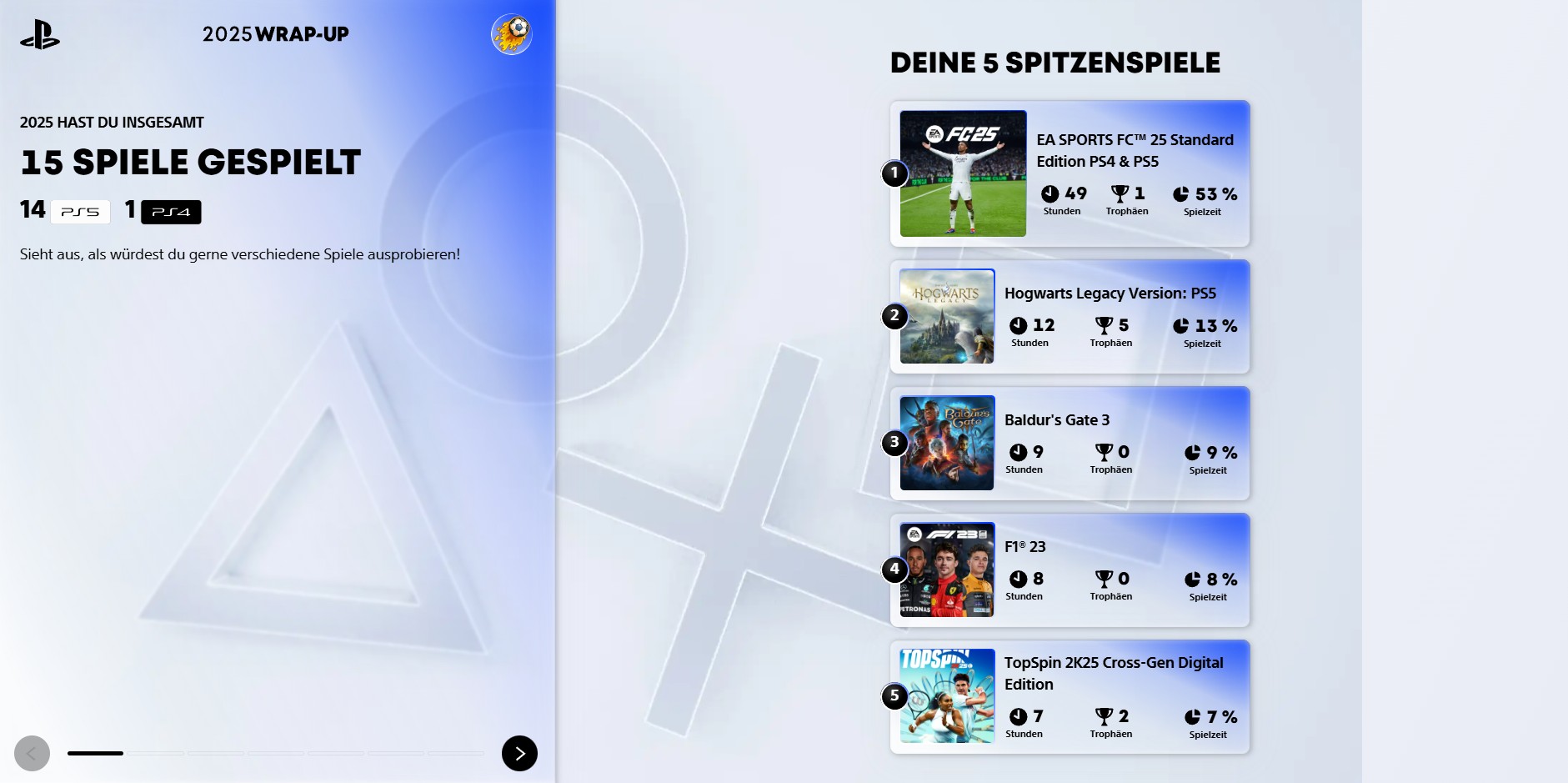 FC25, F123 und Top Spin alles in der wöchentlichen Onlinesitzung mit nem Freund. Alles andere ist auf erschreckend niedrigem Niveau.