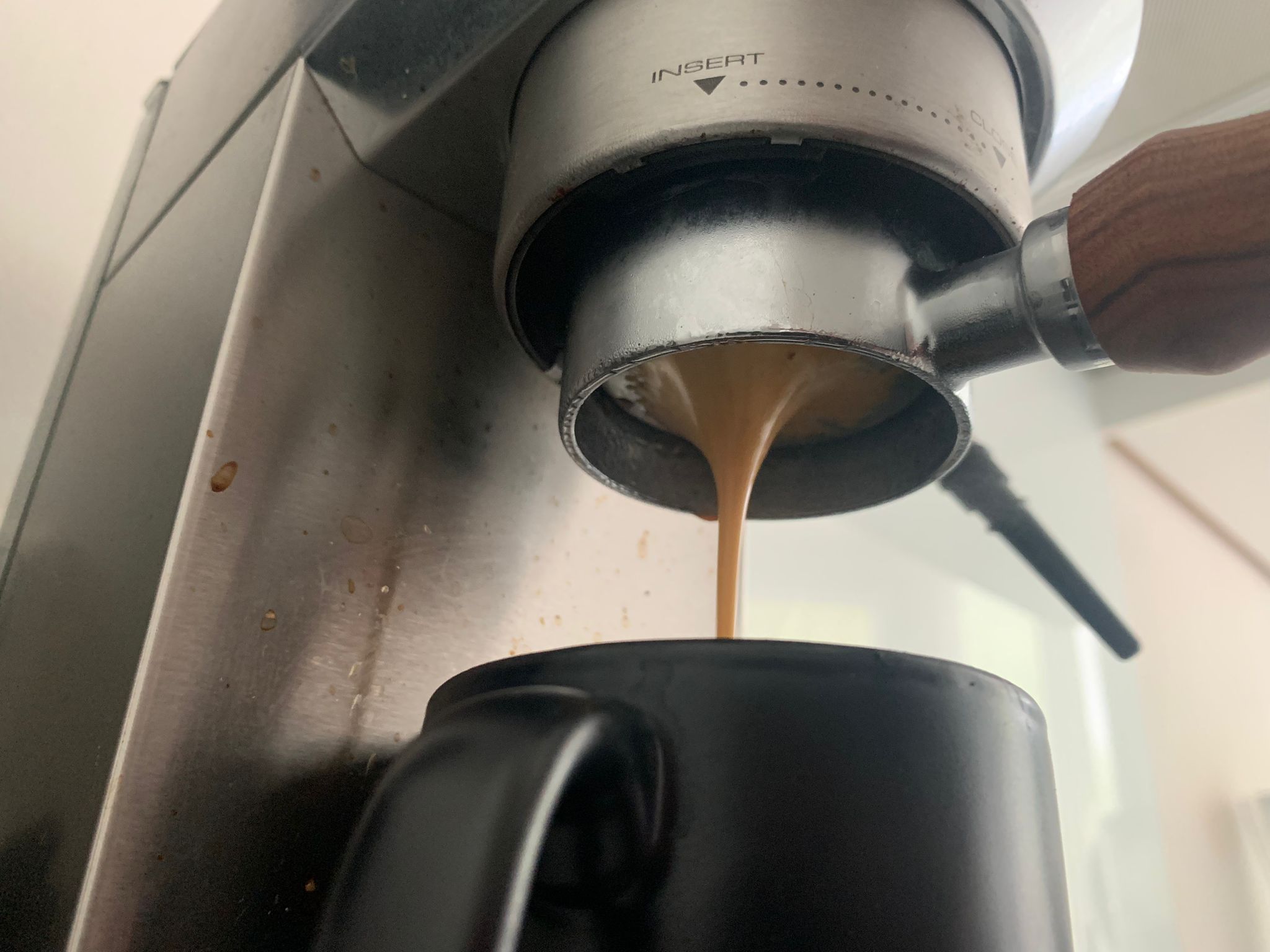 Nach 2 Monaten Sauerei, rumgespritze und Kram heute zum ersten Mal einen relativ ansehnlichen Kaffee aus dem bodenlosen Siebträger bekommen mit der günstigen Dedica. Bissle stolz