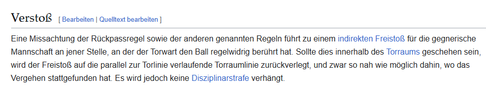 Hier, spannende Sache heute bei uns im Spiel: Unser Keeper nimmt eine verunglückte Abwehraktion, die in einer Bogenlampe endete, in die Hand. Schiri sagt Rückpass und damit indirekter Freistoß, was ich mindestens diskussionswürdig finde. Aber geschenkt.