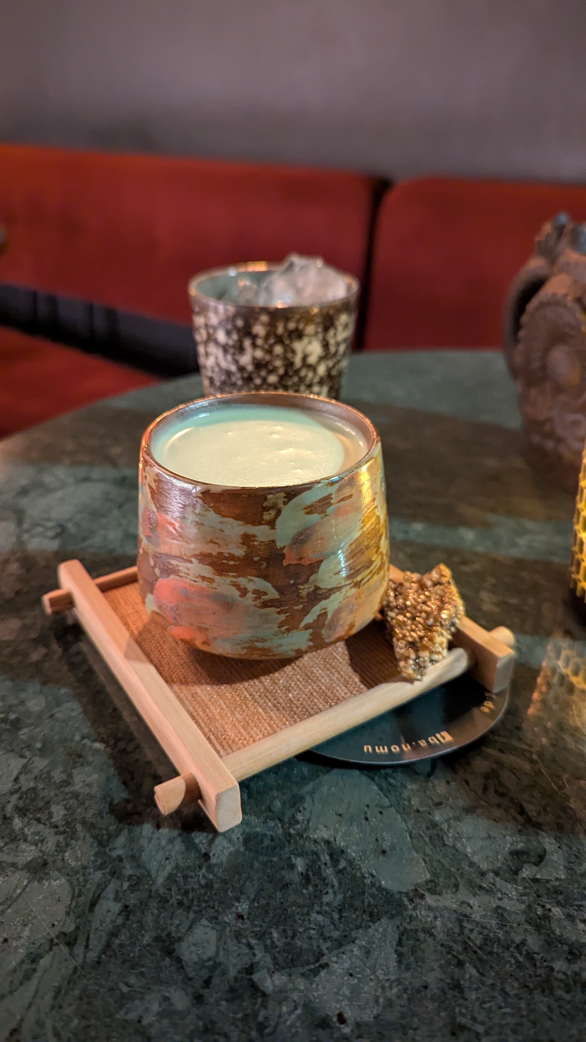 Midori (Rechts: Gin, Kardamom, Matcha, Cointreau, weiße Schokolade, Kokoswasser, Calpis, Limette, Pandan)