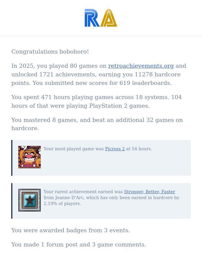 Heute gingen etwa die RetroAchievement-Jahresrueckblicke raus die immer ein paar nette Statistiken bieten.