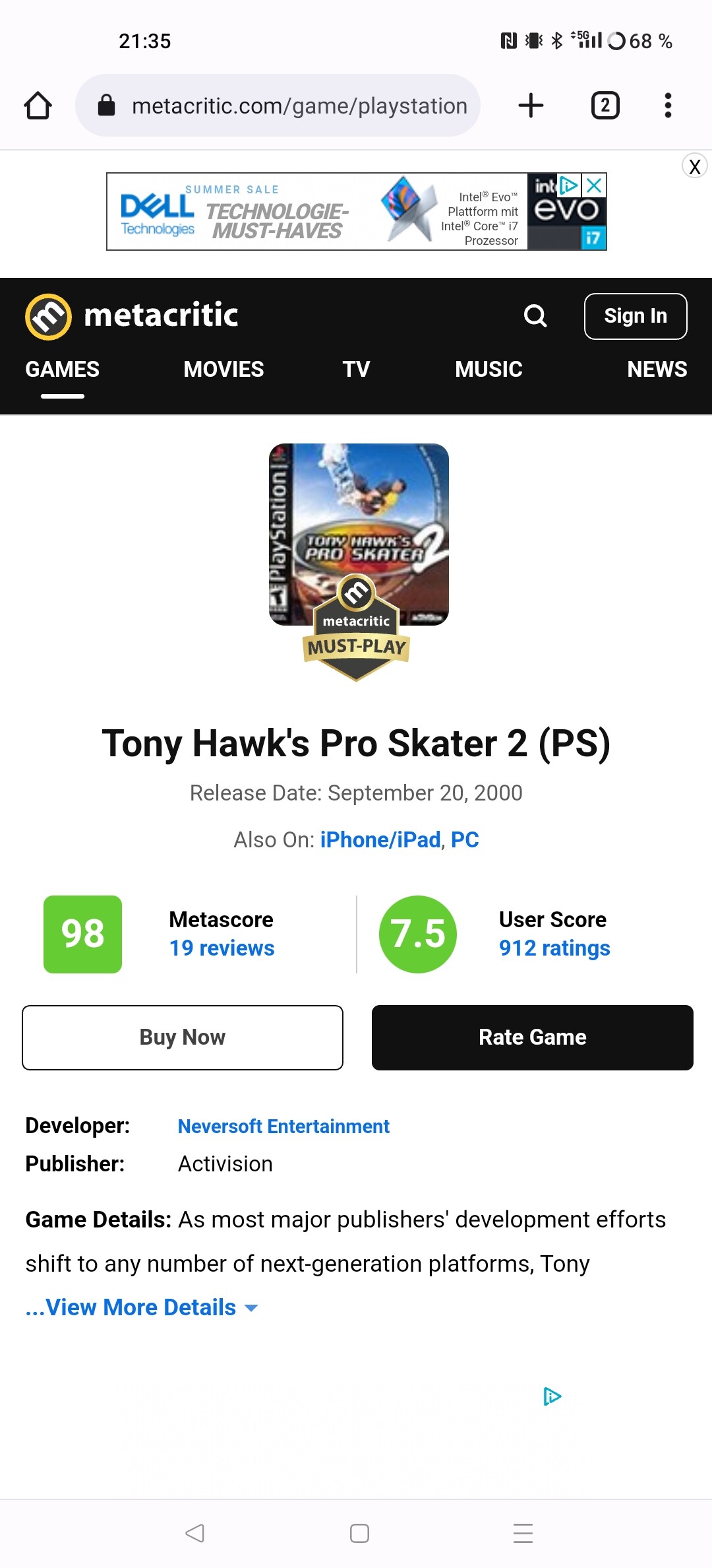 Tony Hawk 2 ist immer wieder die größte Überraschung, wenn man die best bewerteten Spiele bei Metacritic checkt.