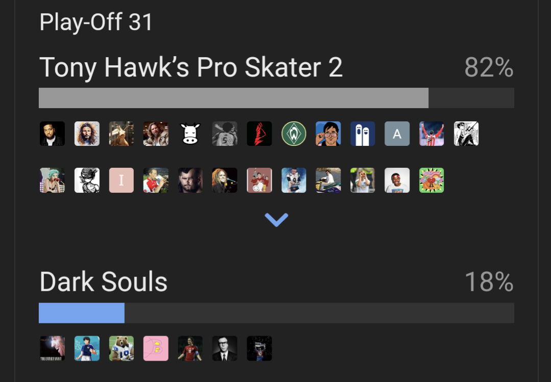 Pfffffffft….ich habe ca. 80% der Spiele nie gezockt, knapp 40% sagen mir noch nichtmal was. Also hab ich bei jedem Abspiel dann nach Klangfarbe entschieden. Bei mir hätte z. B. demnach Drägggggenbol nie eine Chance