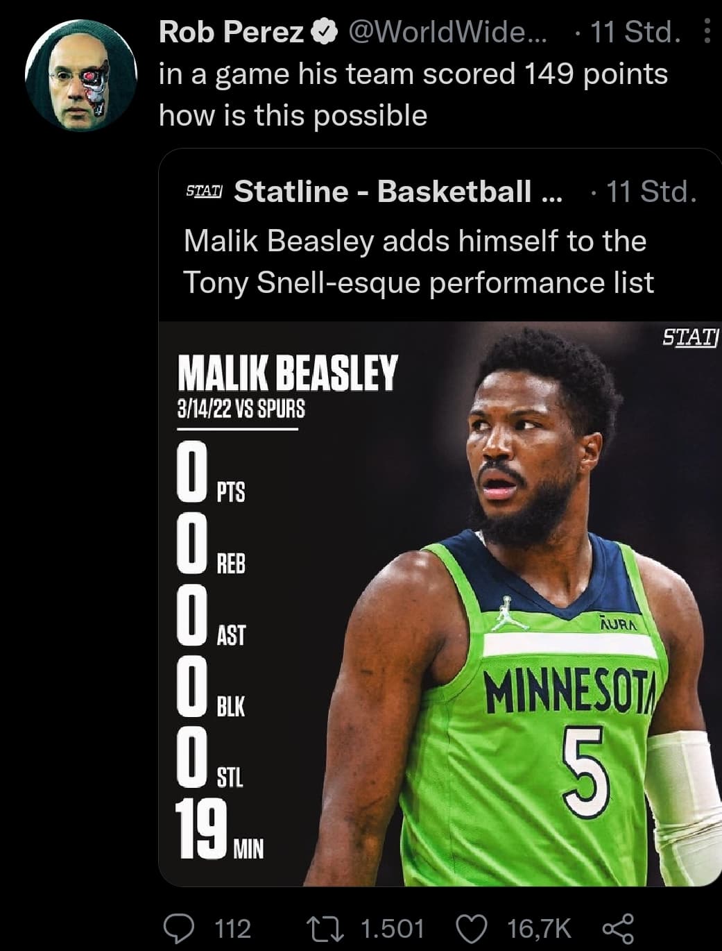 Und Towns startet direkt Mal mit 60 Punkten, 17 Rebounds, 7 Dreiern bei 61% aus dem Feld und 93% an der Linie. ![]()