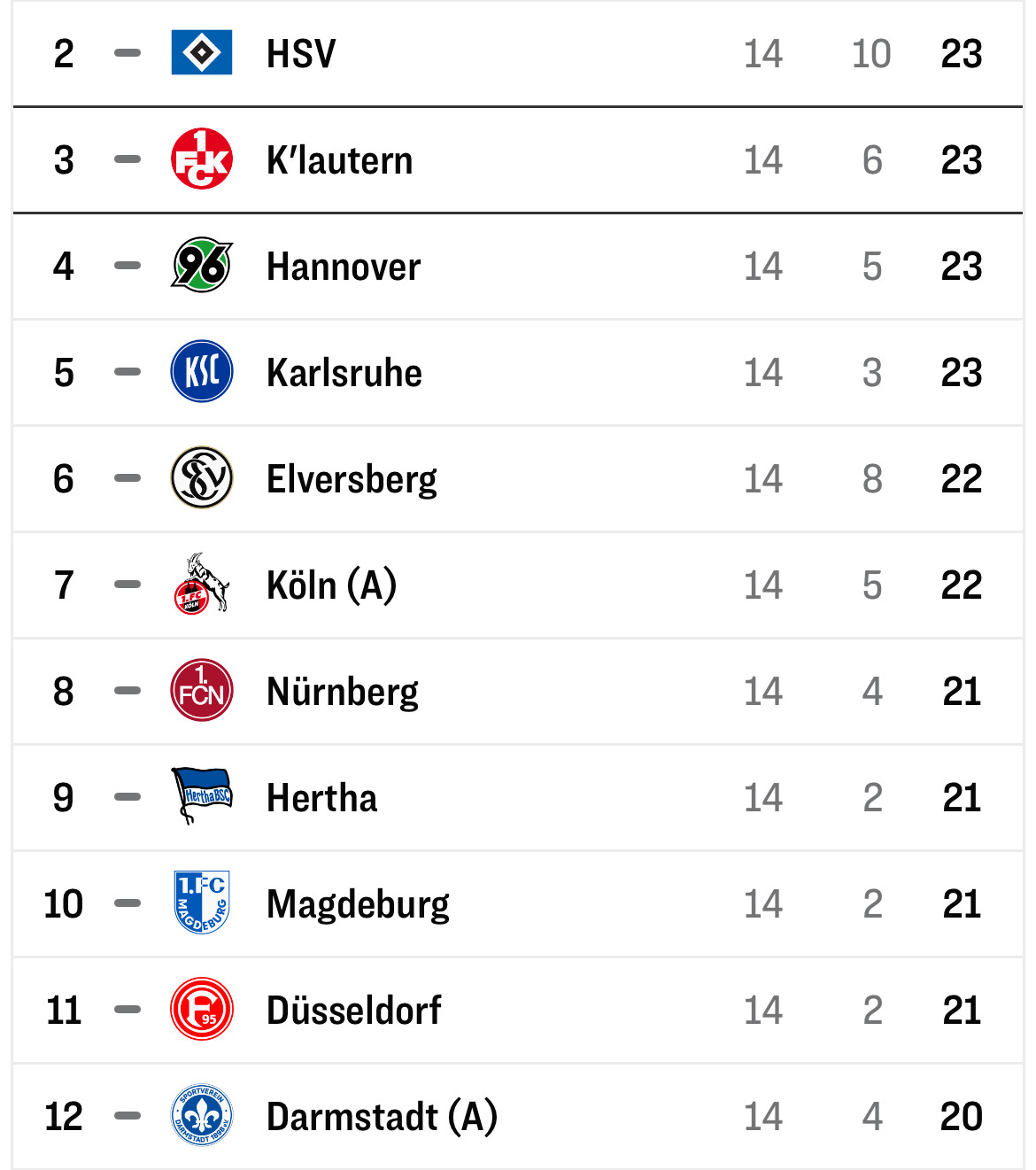 Zweite Liga einfach mega dieses Jahr. Bis Platz 12 einfach alle Teams im Aufstiegsrennen. Dazu diese Inkonstanz aller Teams. Völlige Lotterie wer da am Ende auf den ersten drei Plätzen landet.