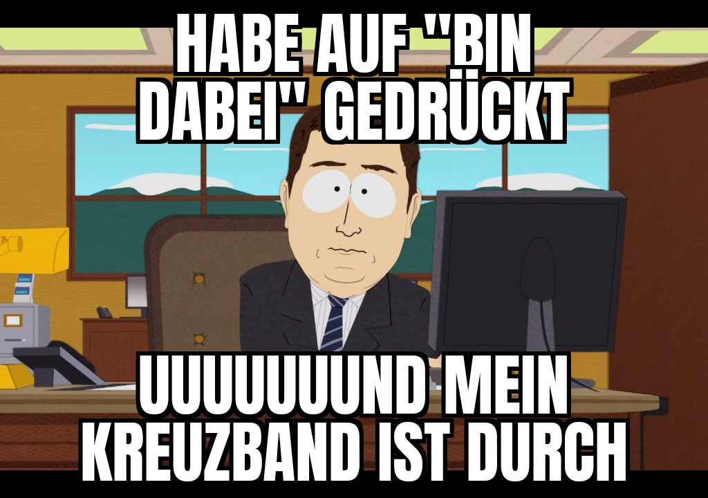 Joa. Zweite Minute. Ball im 16er abgeschirmt, Verteidiger will von hinten durch meine Beine an den Ball. Trifft mein Kniegelenk von innen, das knickt komplett nach außen weg. Lautes Knacken, heftiger Schmerz. Das war wohl meine Saison jetzt.