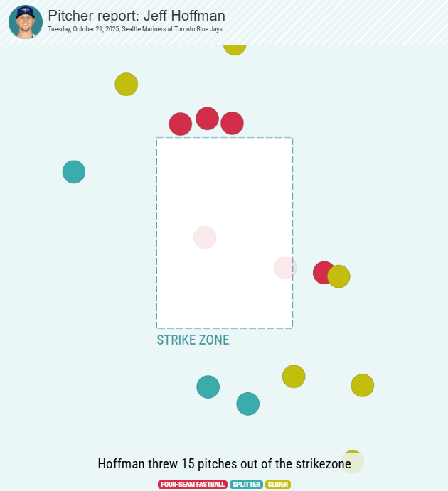 Spiel 1 - Seattle hat zwei Tage nach dem Marathon Match gegen Tigers keine Pitcher mehr und lässt Bryce Miller starten, der ein Horrorjahr mit 5.68 ERA hatte und seit April keinen Start mehr pitchte, bei dem er weniger als 2 Runs kassierte. Torontos Offensive kommt heiß aus der Serie gegen die Yankees.
