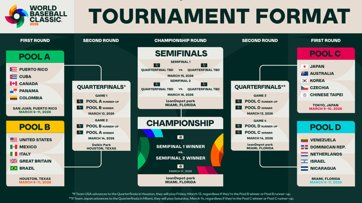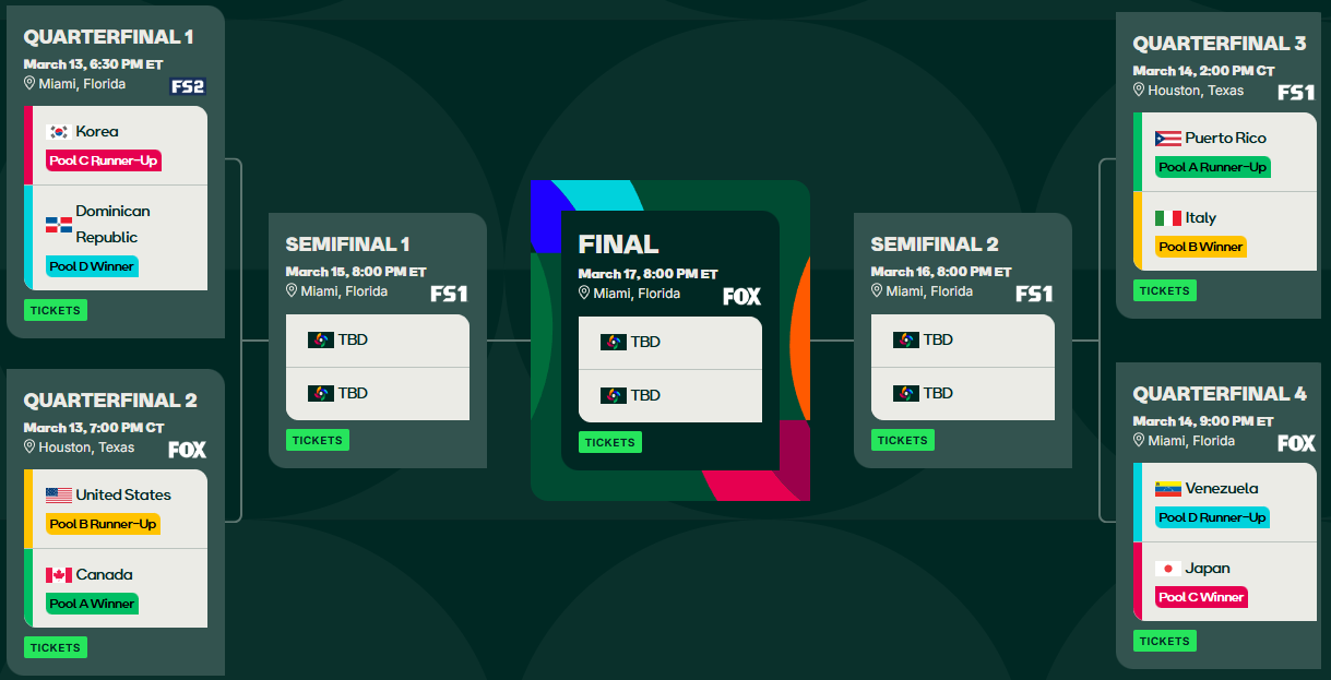 Die Viertelfinalspiele werden am 13. Und 14. März ausgetragen, dabei spielen die Gruppe A und B sowie die Gruppe C und D überkreuz. Die USA hat also ein potentiell leichteres Los, während die Chancen sehr hoch sind, dass wir bereits im Viertelfinale den Kracher Japan vs. Dom Rep oder Japan vs. Venezuela zu Gesicht bekommen werden.