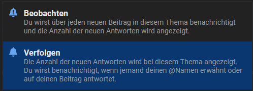 Bei Beobachten kriegst du Benachrichtigungen bei jedem Beitrag, bei Verfolgen nur wenn du erwähnt wirst, oder jemand auf deinen Beitrag direkt antwortet.