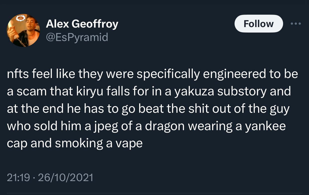 Bin mittlerweile in Kapitel 10 und mir geht’s wahrscheinlich so wie den FF7 Zockern, wenn sie Rebirth spielen und alte Locations und Charaktere in neuem Glanz begutachten können. Diese ganzen Verweise auf die vorherigen Teile (Taichi im Hostessen-Club oder auch der Barkeeper im Revolve - Richardson anyone?) lassen mein Herz höher schlagen.